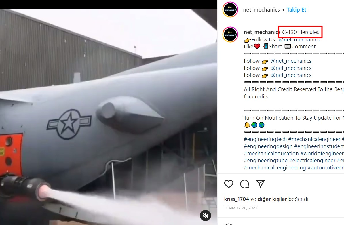 Sanayi ve endüstri konularında video paylaşımı yapan bir Instagram sayfasına ulaşıyoruz. İlgili video 26 temmuz 2021’de paylaşılmış. Gönderinin açıklama kısmında taşıtın isminin “C-130 Hercules” olduğu belirtilmiş. Bu uçak modelini araştırdığımızda, bunun birçok amaçla kullanılan taktik nakliye uçağı olduğu sonucuna ulaşıyoruz.