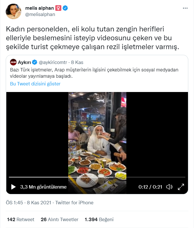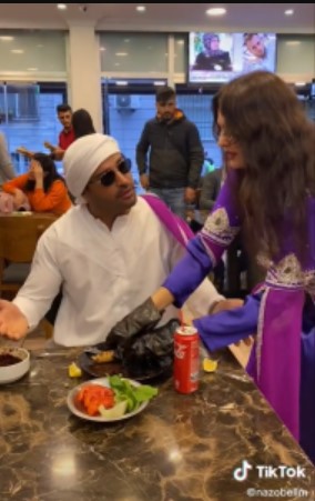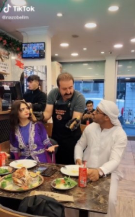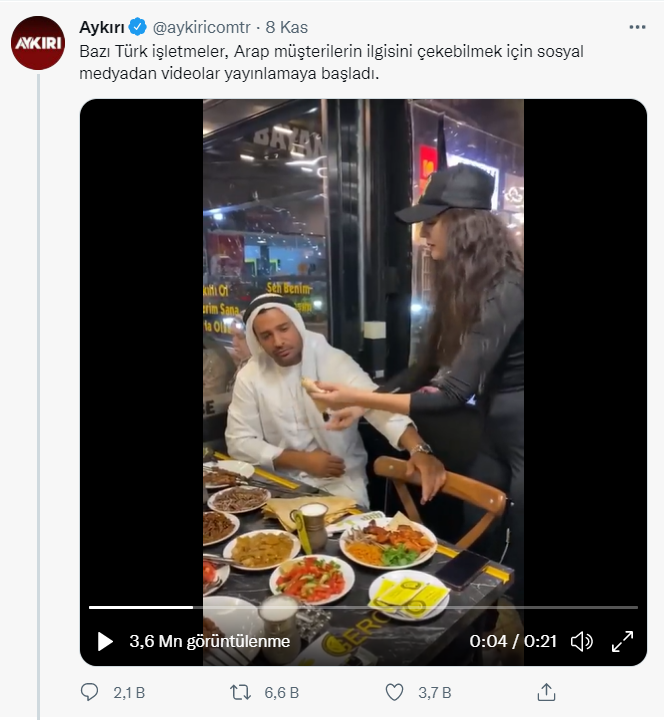 Bir Türk restoranında çekilen videoda, üzerinde geleneksel Arap kıyafetleri bulunan bir müşteri ve ona servis yapan ve elleriyle yemek yedirip ayran içiren bir personel görülüyor. 29 binden fazla beğeni ve yüzlerce yorum alan paylaşım sosyal medyada çokça etkileşime sebep oldu.