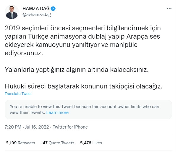- AK Parti Genel Başkan Yardımcısı Hamza Dağ, Twitter hesabından videonun Arapça dublajlı versiyonunu hazırlayanlar hakkında hukuki süreç başlatıldığını yazmış.