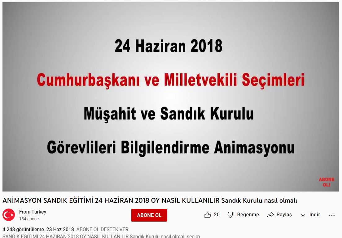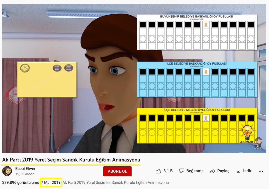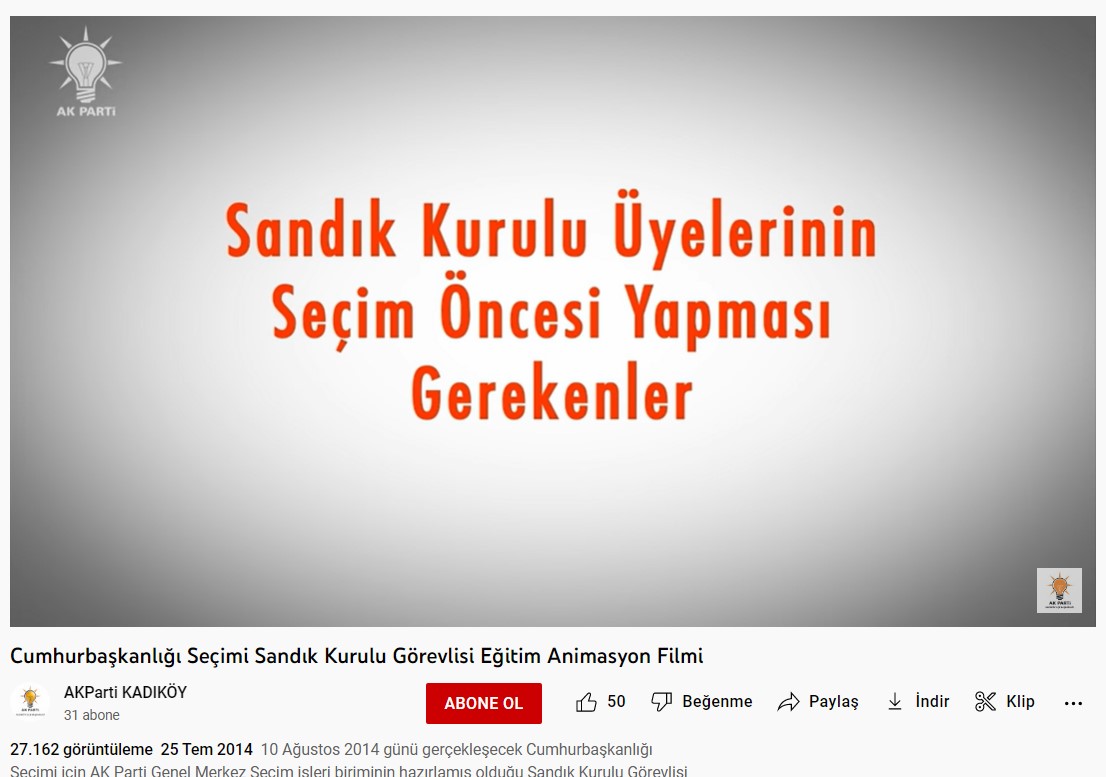 - Söz konusu video, 2019’da AK Parti Genel Merkez Seçim İşleri Birimi tarafından, Türkçe dilinde seçmen ve seçim sandık kurulu eğitimi olarak hazırlanmış.