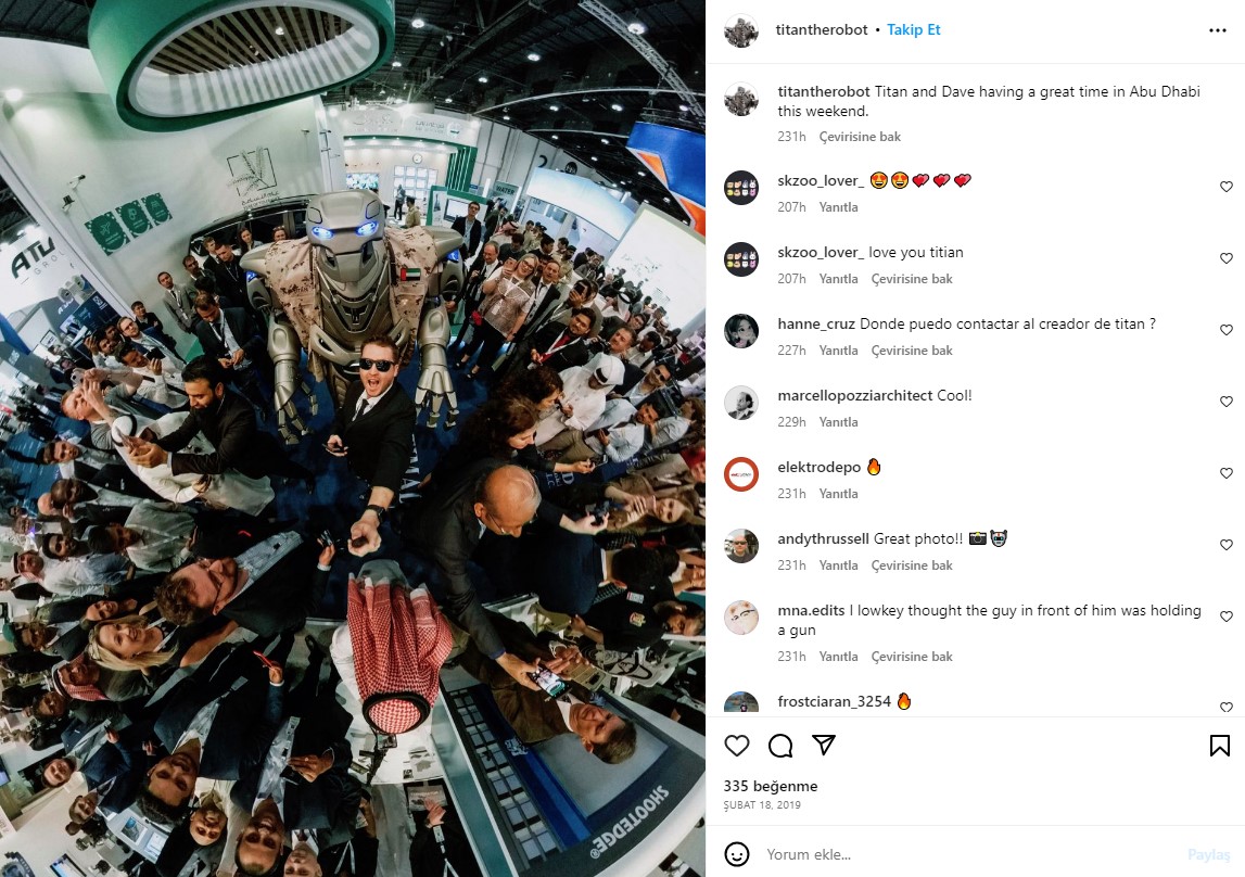 İşbu videoda da 2 metre 60 kiloluk bu kostümün, Birleşik Arap Emirlikleri’nde yer alan Abu Dabi Ulusal Fuar Merkezi’nde düzenlenen bu organizasyonda gösteri yaptığını anlıyoruz. 2019’da yapılan bu etkinliğin YouTube’taki video kayıtlarını incelediğimizde, Titan’ın fuardaki ziyaretçileri Arapça ve İngilizce dilinde selamladığı görülüyor.