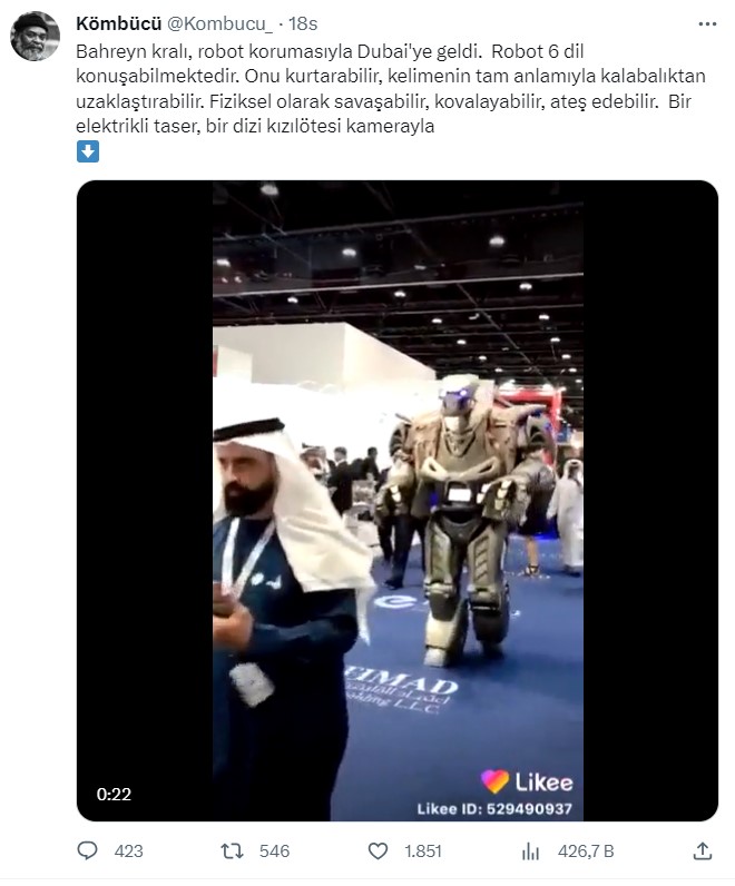 Twitter’da paylaşılan bir video, kısa sürede gündem oldu. Gönderide, fuar benzeri bir mekanda Bahreyn Kralı olduğu iddia edilen bir kişinin, bir tür koruma robotu ile birlikte yürüdüğü iddia edildi.