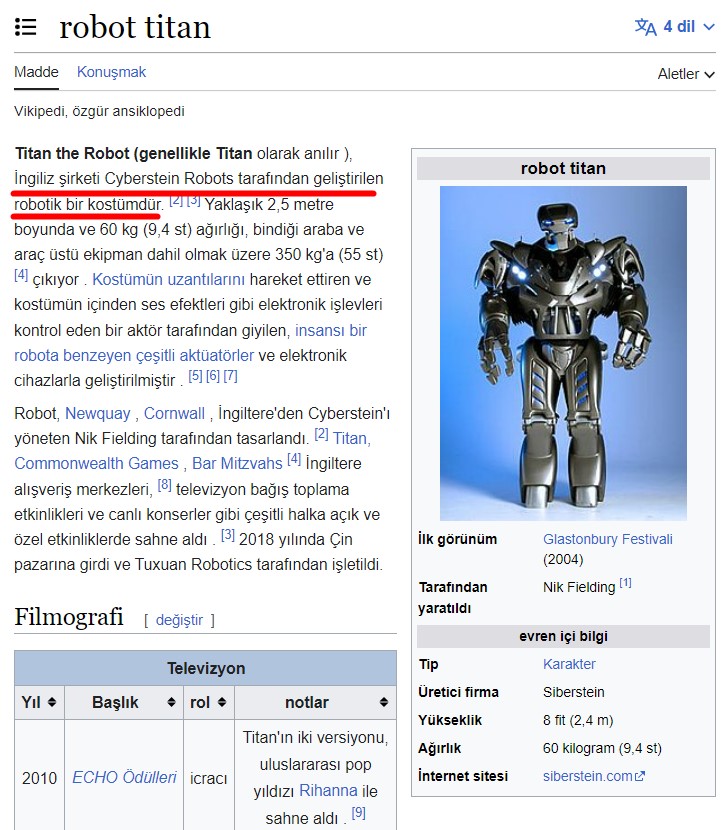 Mekanın zemininde yazan “Etimad” ifadesiyle “Robot” kelimesini kullanarak görsel taraması yaptığımızda, bu aracın isminin “Titan the Robot” olduğu sonucuna ulaştık. Ancak bu araç, bildiğimiz robotlardan çok teknolojik bir kostüm amaçlı tasarlanmış. Titan, içine giren bir aktörün kontrolüyle hareket eden bir gösteri kostümü. Nik Fielding tarafından yaratılan Titan, 2004 yılından bu yana çeşitli etkinliklerde ve organizasyonlarda gösteri yapıyor.