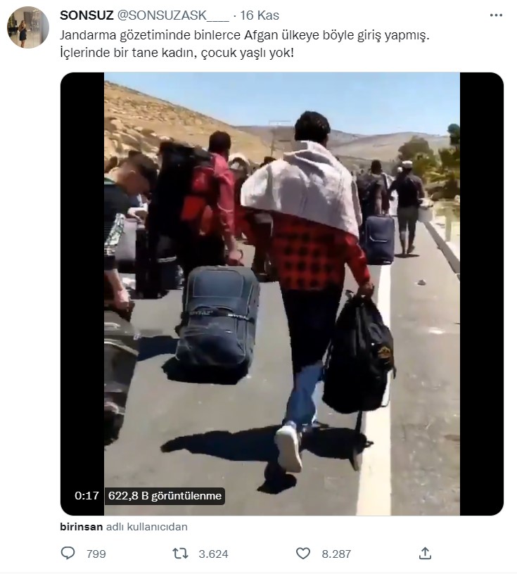 Twitter’da yayılan bir videoda, ellerinde valiz taşıdığı görülen bir grup kişinin Afgan olduğu ve sınırı geçerek Türkiye’ye girdiği iddia edildi. Videoyu paylaşan kişi, şu açıklamalarda bulundu: