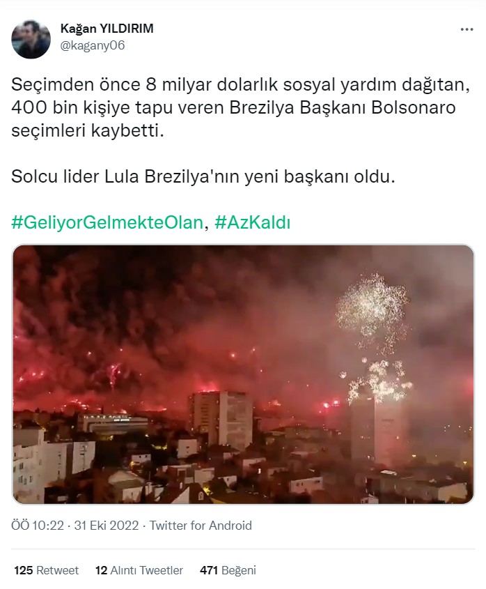 Brezilya’da devlet başkanı seçimi ikinci tur sonuçlarına göre belli oldu. İkinci turda oyların %50,83’ünü alan solcu eski Devlet Başkanı Luiz Inacio Lula da Silva, ülkenin yeni başkanı oldu. Luiz Inacio Lula da Silva’nın Brezilya’daki başkanlık seçimlerini kazanmasının ardından seçim sonrasına ait olduğu iddiasıyla bir kutlama videosu dolaşıma girdi.