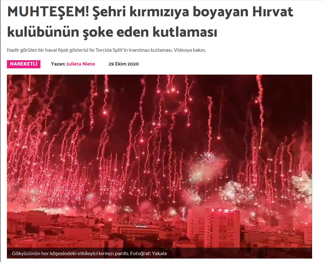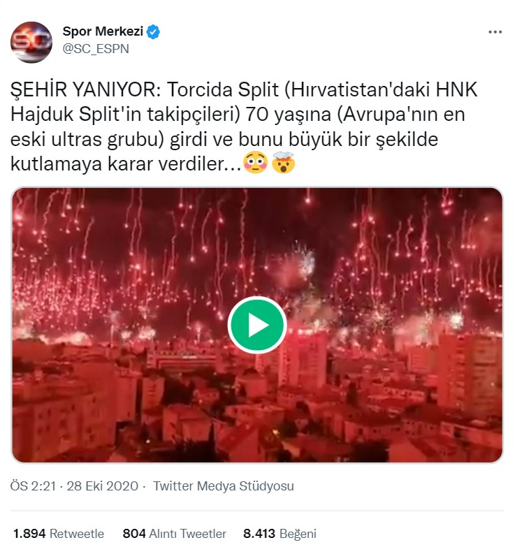 3 milyon takipçili Sports Center videoyu, “Şehir yanıyor: Torcida Split (Hırvatistan’daki HNK Hajduk Split’in taraftarları) 70 yaşına (Avrupa’nın en eski ultras grubu) girdi ve bunu büyük bir şekilde kutlamaya karar verdiler.” açıklaması ile paylaşmış.