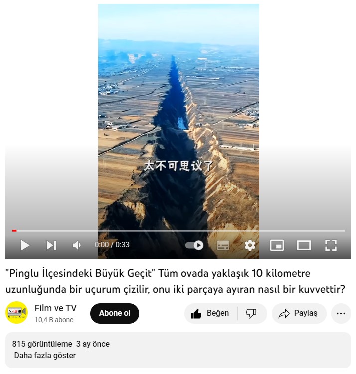 2022’de kaydedilen videolarda, kuş uçuşu çekilen bu bölgenin “Pinglu” olduğu bilgisi sabit. Bunu Google Earth üzerinden de doğrulamak mümkün. Pinglu’daki bu doğal yarık uydu görüntülerinden rahatlıkla seçilebiliyor.