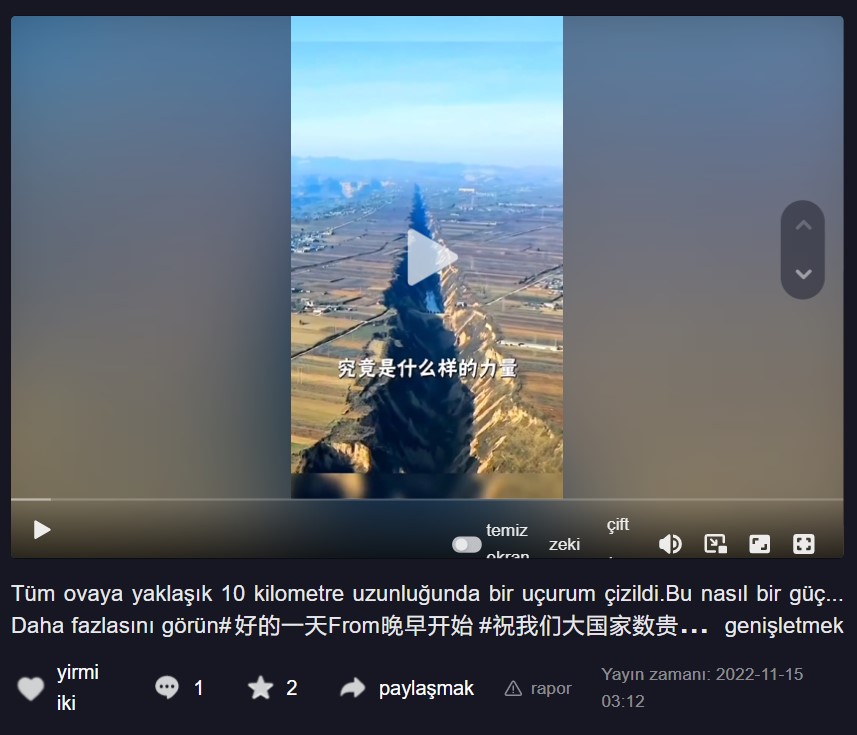 Bunu doğrulamak ve yeri tespit edebilmek için tersine görsel arama yöntemine başvuruyoruz. Fakat internette bu görüntüler ile alakalı herhangi bir bulguya rastlayamıyoruz. Ardından videonun altındaki yorumlar bölümünde bir kullanıcının paylaştığı bilgilendirme mesajı dikkatimizi çekiyor. Kullanıcı bunun 2022’de Çin’de kaydedildiğini belirtmiş.