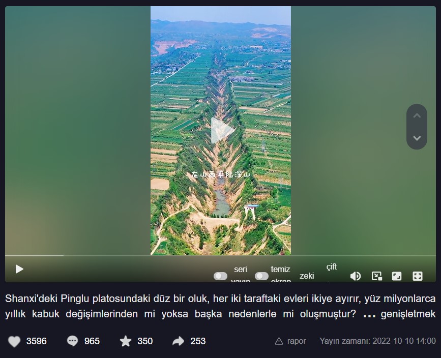 Şimdi geriye bulmamız gereken tek cevap kalıyor. Video Çin’de mi kaydedildi? Bunu öğrenmek için videodaki bilgileri anahtar kelime olarak kullanıyoruz ve Çince “Pinglu”, “Shanxi”, “Crack” kelimelerini Google’da aratıyoruz. Karşımıza TikTok’un Çin’de kullandığı marka ismi olan Douyin’den bazı videolar çıkıyor.