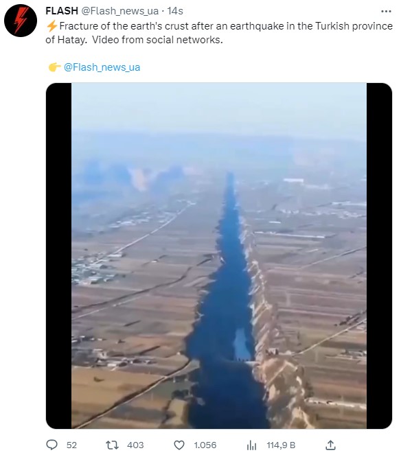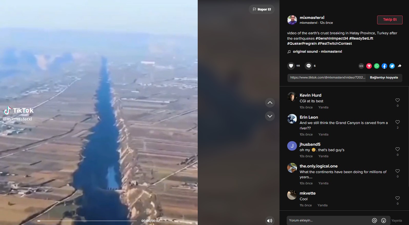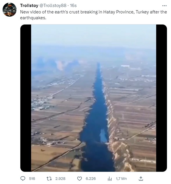 Başta Twitter olmak üzere birçok sosyal medya ağında gerek deprem esnası, gerekse deprem sonrası ile bağdaştırılan birçok doğrulanmamış görüntü paylaşılıyor. Geçtiğimiz gün internette depremin en fazla etkilediği illerden olan Hatay’da devasa boyutta bir yarık oluştuğu iddia edildi. Yayılımda olan videoda, Hatay’da oluştuğu öne sürülen yarığın kuş uçuşu çekimi görülmekte.