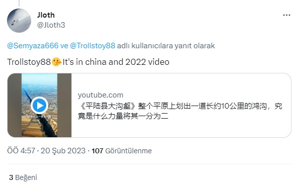 Daha sonra eklediği bağlantı linkini tıkladığımızda, Çince yayın yapan bir YouTube kanalında ilgili görüntülerin 3 ay öncesinde paylaşıldığını görüyoruz. Dolayısıyla videonun Kahramanmaraş Depremi’nden sonraki bir tarihte çekildiği iddiasını çürütmüş oluyoruz.