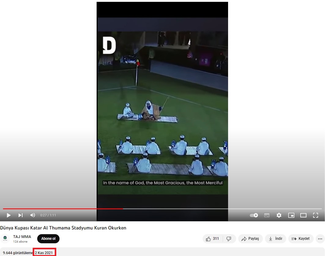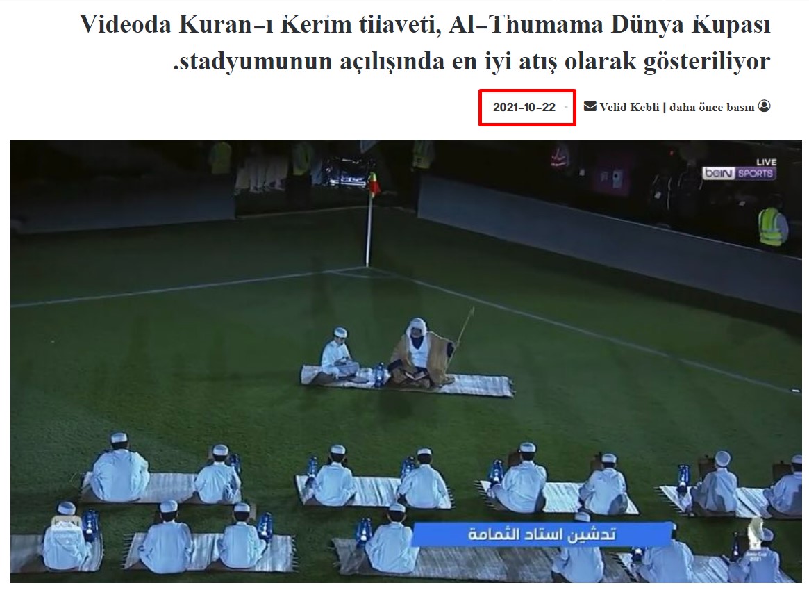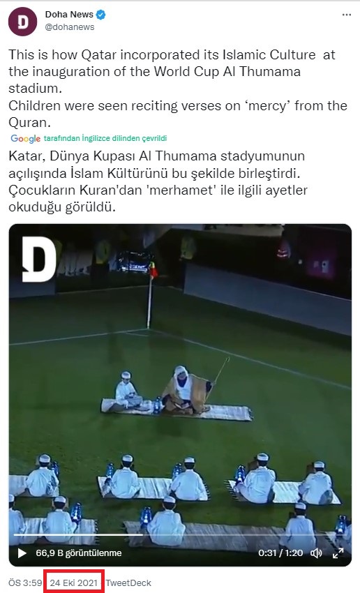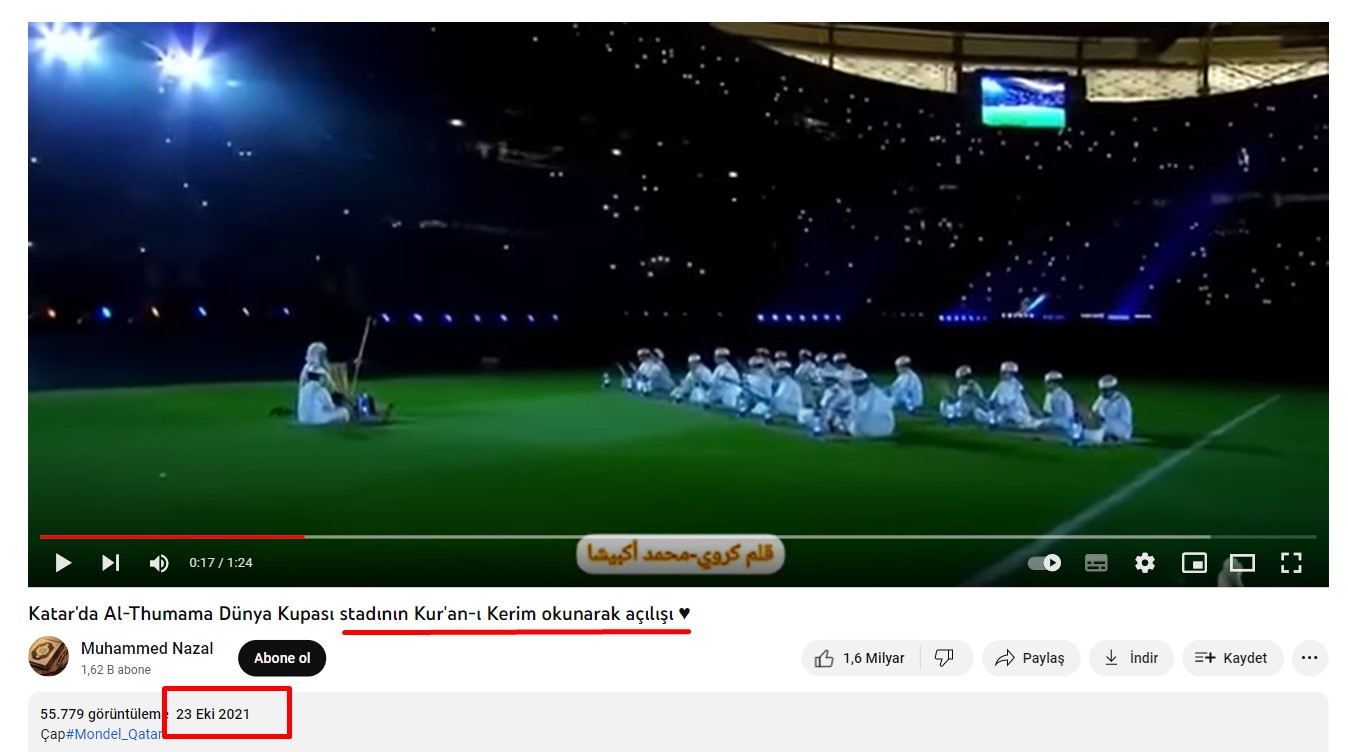 İddiaya eklenen videodan ekran görüntüsü alarak tersine arama metoduyla tarama yaptık. Böylece videonun 2021 yılının ekim ayında, Dünya Kupası için inşa edilen Al Thumama Stadyumu’nun açılışında çekildiğine dair çeşitli haberlere ulaştık. 22 Ekim 2021’de çocukların Kur’an okumasıyla açılan stadyum ilk olarak Al Sadd ile Al Rayyan takımları arasındaki maça ev sahipliği yapmış.