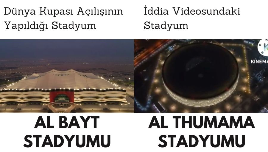 Dünya Kupası’nın açılışı, Katar – Al Khor’da bulunan Al Bayt Stadyumu’nda yapıldı. İddia videolarında yer alan stadyum ise Doha’da yer alan Al Thumama Stadyumu.