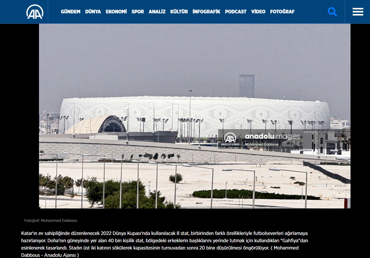Doha News de 2021 ekiminde yaptığı paylaşımda Al Thumama Stadyumu’nun açılışına yer verdi: