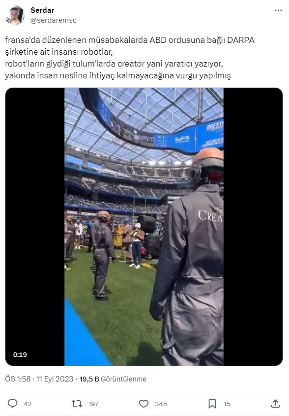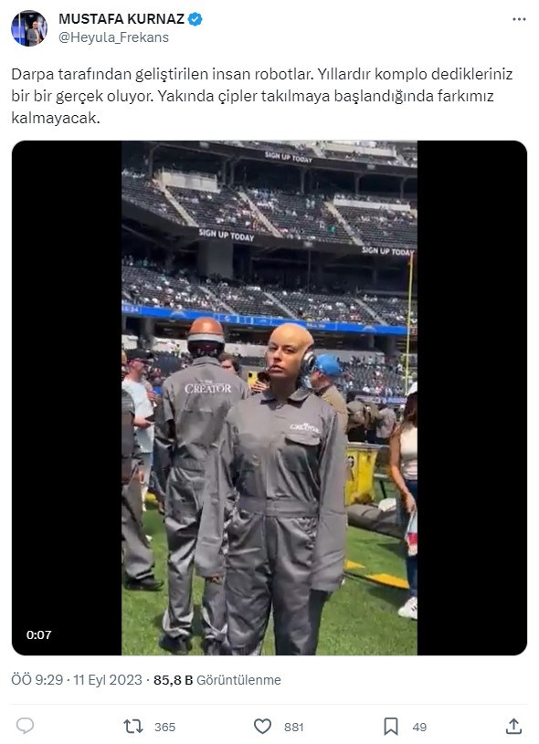 Daha sonra stadyuma benzeyen bir alanda çekildiğini düşündüğümüz görüntüdeki kişilerin kıyafetinin sırt ve omuz kısmında yazan “The Creator” yazısı dikkatimizi çekiyor. Ardından “The Creator”, “Robots”, “Stadium” gibi anahtar kelimelerle konuyu araştırıyor ve sonuca ulaşıyoruz.