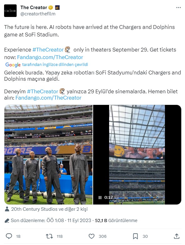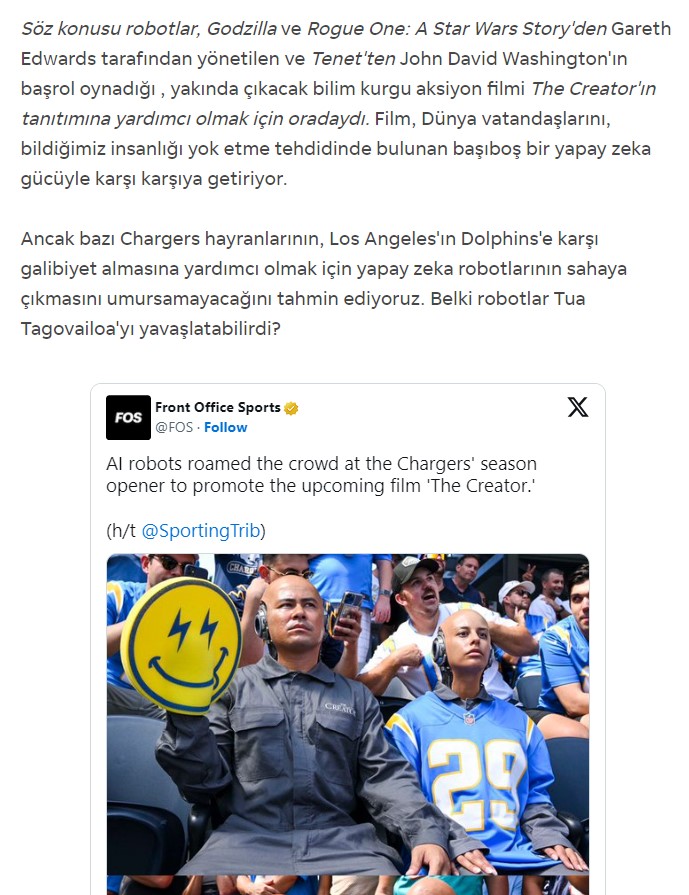 Videodaki kişiler birer reklam figürü olarak 29 Eylül 2023 tarihinde vizyona girmesi planlanan ve başrolünü John David Washington’ın oynadığı ‘The Creator‘ filmi için stadyumdaydı. Amerikan Futbol Ligi’nde (NFL) mücadele eden Miami Dolphins ile Los Angeles Chargers maçında ilgi odağı olan bu kişiler aslında birer figüran. 11 Eylül’de düzenlenen maçtaki bu reklam çalışması dış basında birçok haber kaynağında da yer almış.