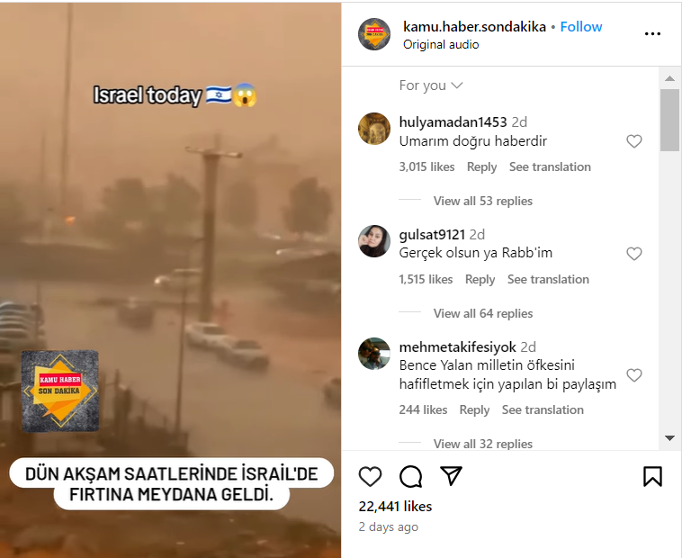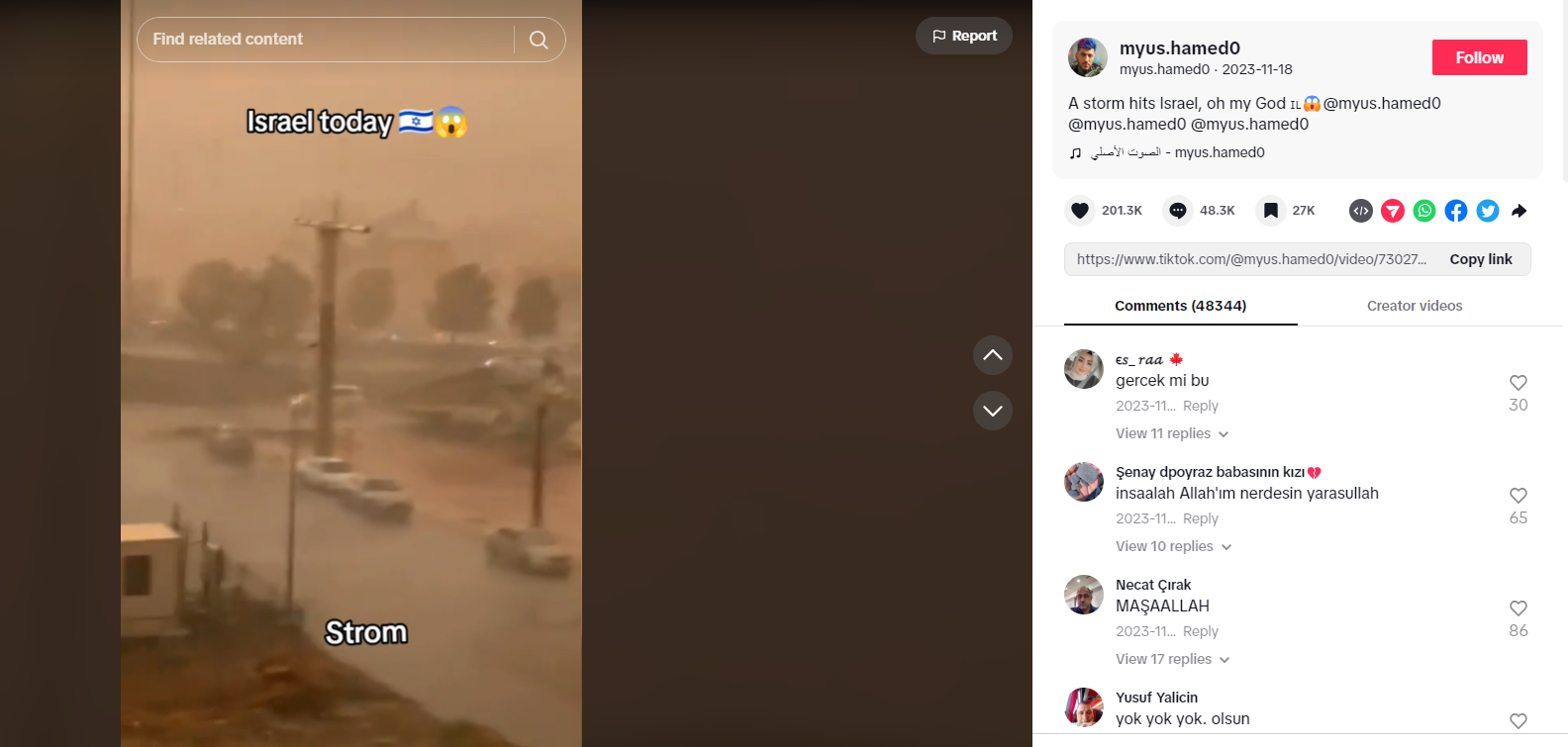 10 Ocak 2024’te Instagram’da paylaşılan bir fırtına videosunun İsrail’de kaydedildiği iddia edildi. Videodan alınan ekran görüntüsü tersine aratıldığında aynı görüntünün geçtiğimiz aylarda da paylaşıldığı görülüyor. 18 Kasım 2023’te İngilizce ‘Israel today’ notu düşülen TikTok paylaşımında da aynı videoya yer verilmiş. Dolayısıyla iki ay arayla ‘İsrail’de bugün’ notuyla paylaşılan videonun en azından güncel olmadığını söylemek mümkün. Peki nerede kaydedildi?