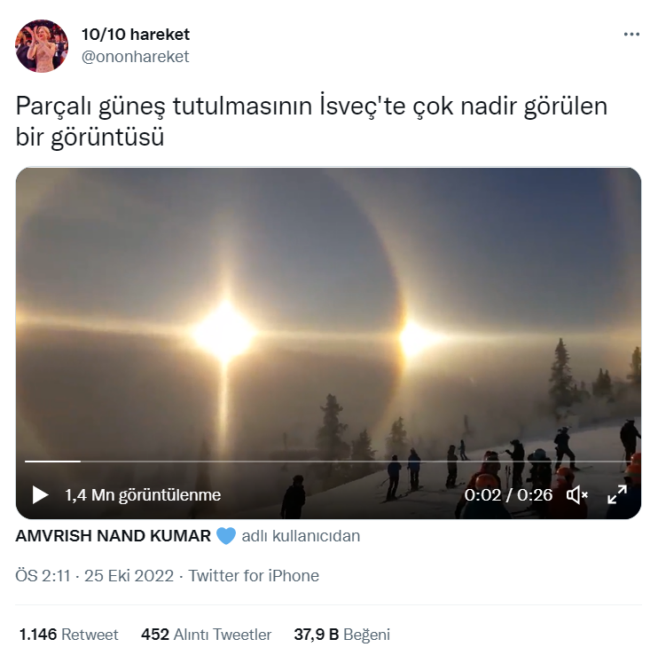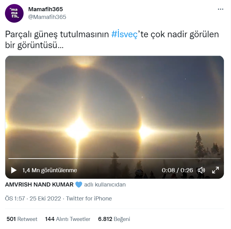 Aslında görüntüdeki atmosfer olayı, Türkçe’de yalancı güneş de denilen parheli. Videoda gökyüzünde 3 tane güneş varmış gibi görünmesinin nedeni ise atmosferde asılı kalan buz kristallerinin ayna görevi görüp ışığı yansıtmasıdır.