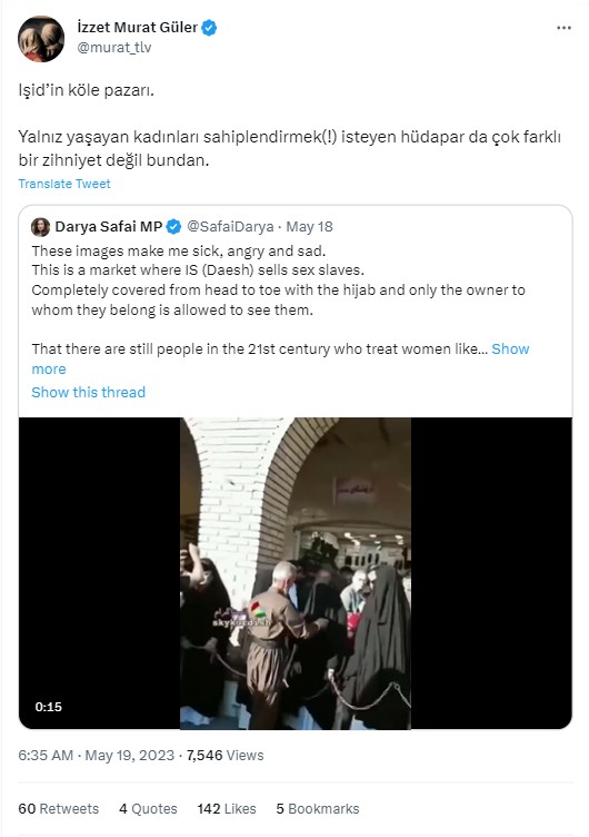 ‘Bu görüntüler beni hasta ediyor, kızdırıyor ve üzüyor. Burası IŞİD’in seks köleleri sattığı bir pazar. (Kadınlar) Başörtüsü ile tepeden tırnağa tamamen örtülü ve sadece ait oldukları sahibin onları görmesine izin veriliyor.