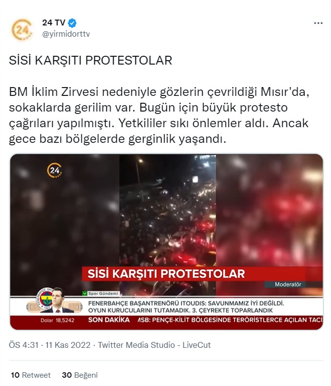 Videodaki protesto, yapılan çağrıların ardından Mısır’daki bir futbol maçının sonrasında yaşananları gösteriyor. Mısır Premier Ligi’nin iki takımı Al Ahly – Zamalek maçının sona ermesinin ardından Mısır’ın Devlet Başkanı Sisi protesto edilmişti.