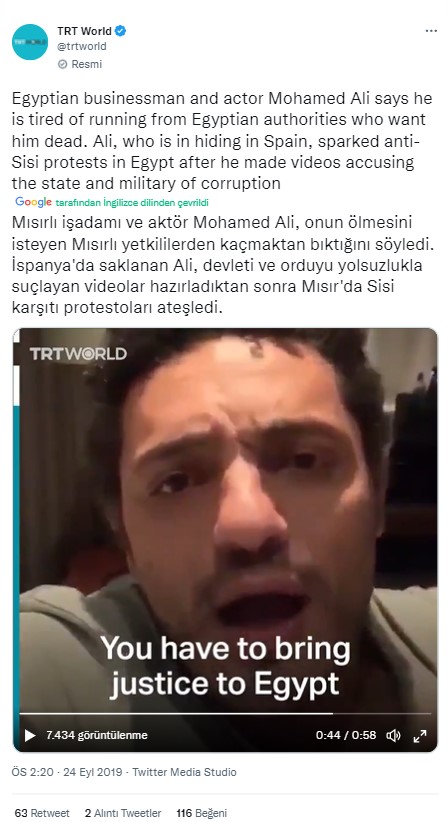 2019 yılında, İspanya’da yaşayan oyuncu ve iş insanı Muhammed Ali, Devlet Başkanı Abdülfettah El Sisi’nin lüks içindeki yaşamına dair videolar paylaşarak halkı sokağa çağırmış ve bu çağrı karşılık bulmuştu. İskenderiye’de ve Süveyş’te protestolar düzenlenmişti.