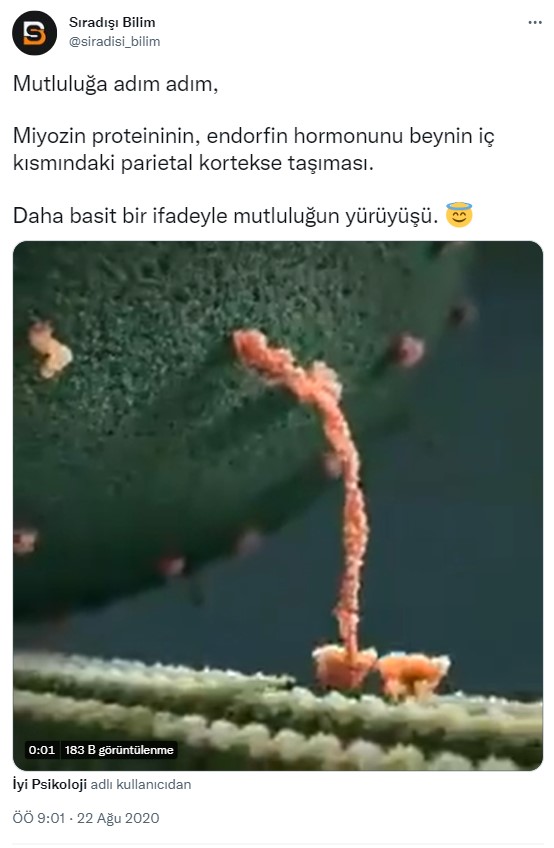 Miyozin de kinesin gibi taşıma görevi üstlenmesine rağmen video ne miyozini ne de endorfin taşınmasını gösteriyor. Ayrıca miyozin, taşıma görevini kas hücrelerinde gerçekleştirirken endorfin, beynin dokularınca üretilir. Miyozin ve kinesin üzerine yapılan araştırmaları incelediğimizde mutluluk hormonu taşıdıklarına dair herhangi bir bilimsel makaleye ulaşamadık.