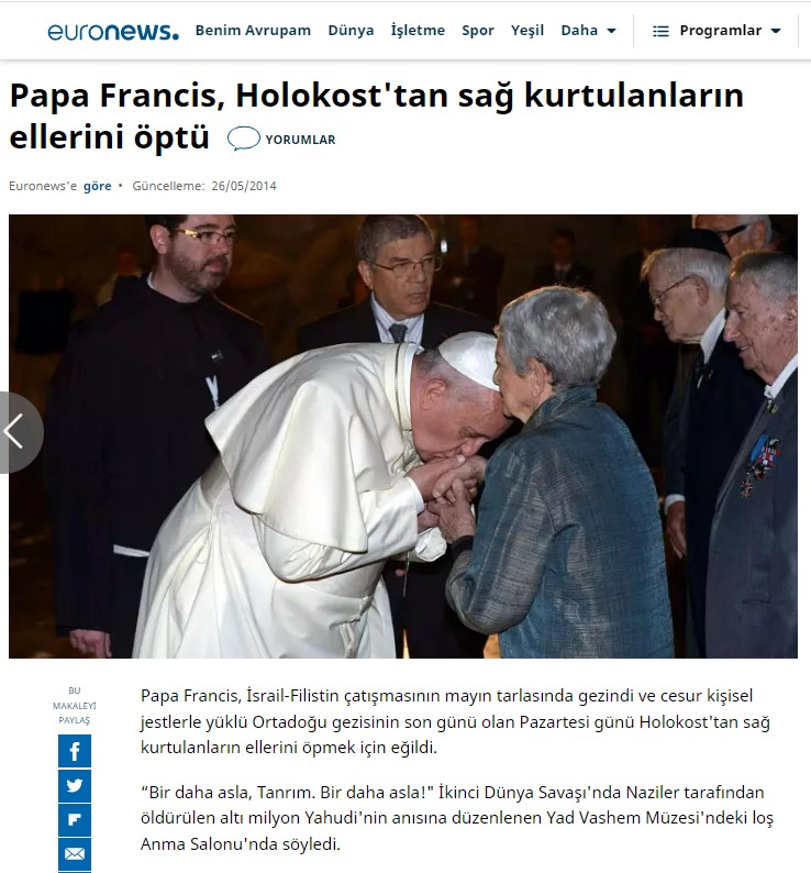 Ardından “Pope Francis”, “Jews (Yahudiler)”, “Kissing hands” ifadeleriyle konuyu aradığımızda, Euro News’in ilgili haberine ulaşıyoruz.
