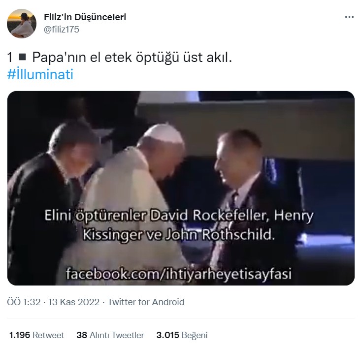Twitter’da bir kullanıcının attığı video 160 binin üstünde görüntülenme aldı. Söz konusu videoda Katolik Kilisesi’nin ruhani lideri Papa Franciscus (Francis), David Rockefeller, yardımcısı Henry Kissinger ve John Rothschild’ın elini öptüğü iddia ediliyor. Bahse konu videoda geçen kişilerin, varlığı günümüzde halen tartışmalı olan sözde ‘İllüminati’ örgütünün birer üyesi olduğu da dile getirilmiş.