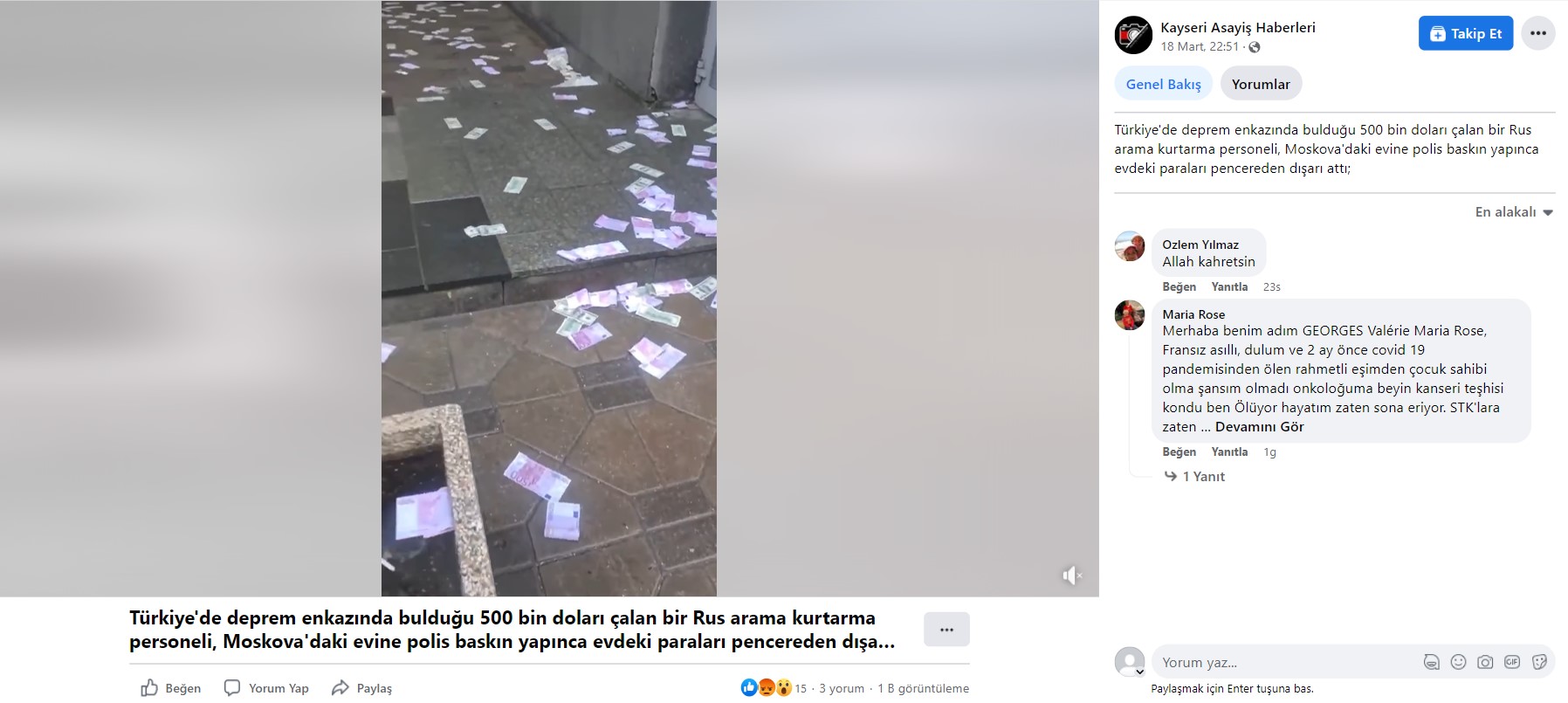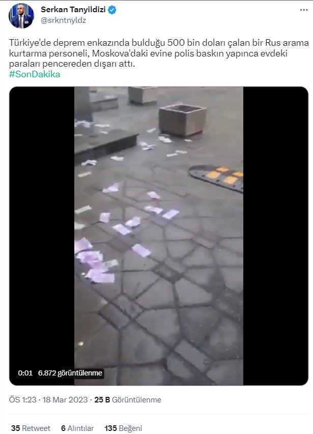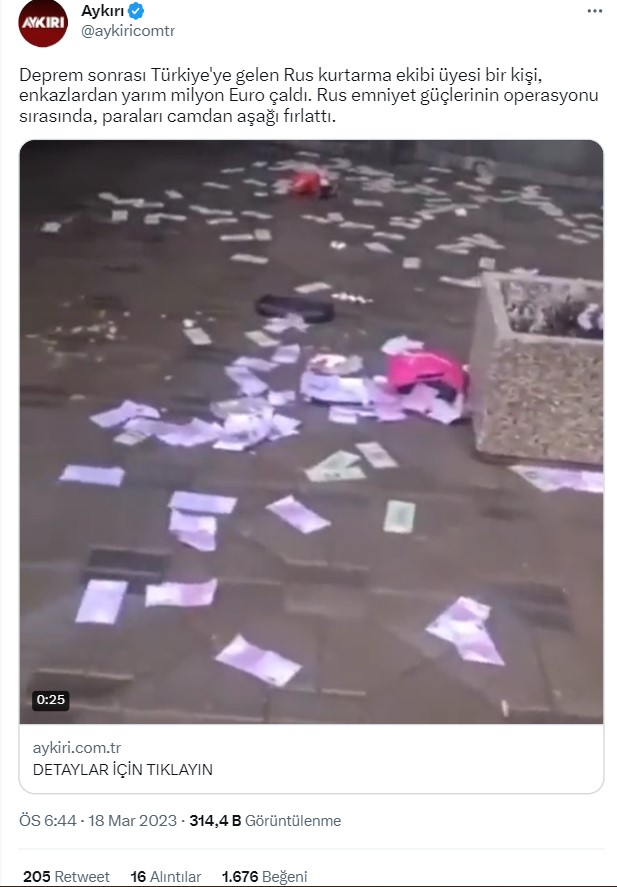 - 6 Şubat depreminden sonra Rus arama kurtarma ekipleri enkazda 150 bin dolar bulmuş ve bunu polise teslim etmişti. Sosyal medyada yayılıma giren videonun açıklamasına bu olay ilham olmuş gibi görünüyor.