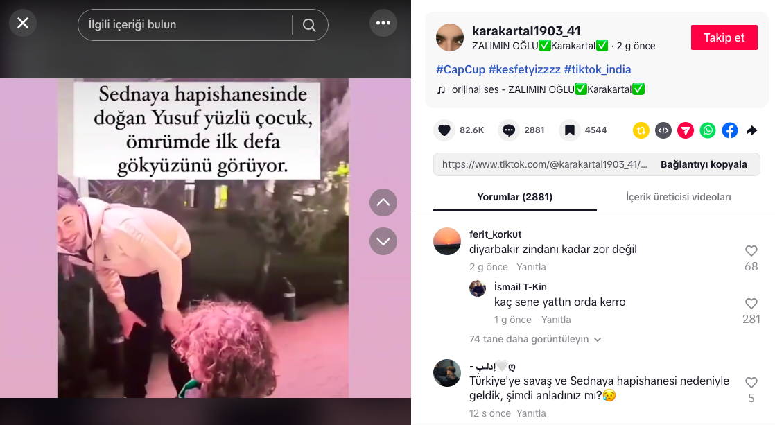 Beşar Esad yönetiminin 8 Aralık 2024’te düşmesinin ardından, Suriye’de vatandaşlar yakınlarından haber almayı umarak ülkenin işkenceleriyle ve kötü şartlarıyla bilinen hapisanesi Sednaya’ya gittiler. Hapishaneye dair pek çok görüntü sosyal medyada da paylaşıldı. Yine geçtiğimiz günlerde TikTok’ta yapılan paylaşımda, Sednaya hapishanesinde doğduğu iddia edilen çocuğun videosu kullanıldı. İddiaya göre çocuk, ilk kez gökyüzünü görüyordu.