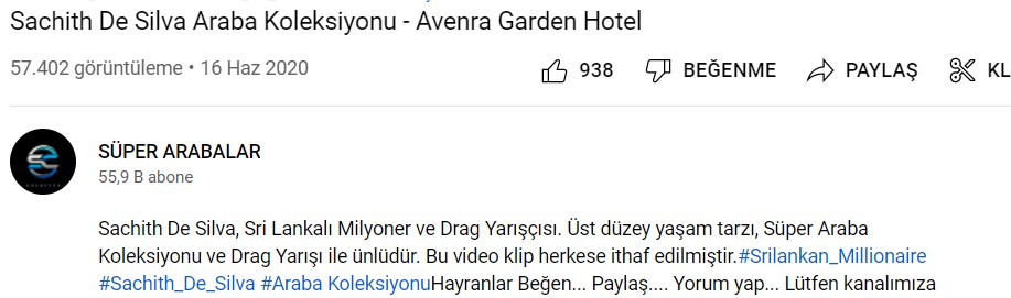 “Sachith De Silva, Sri Lankalı Milyoner ve Drag Yarışçısı. Üst düzey yaşam tarzı, Süper Araba Koleksiyonu ve Drag Yarışı ile ünlüdür. Bu video klip herkese ithaf edilmiştir.”