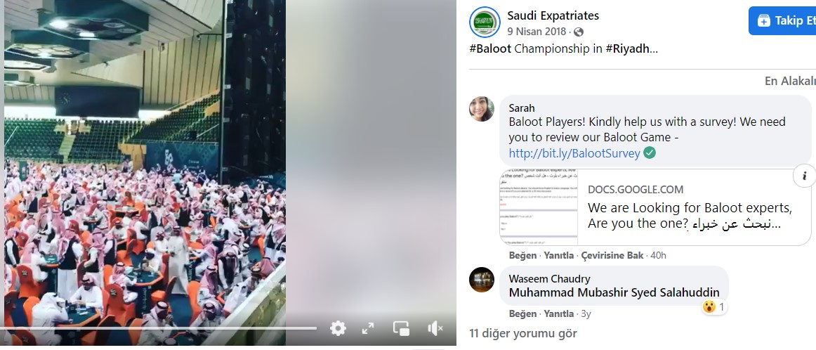 Videodan bir kare alıp tersine arama yöntemi kullanarak aradığımızda, bunun 2018 yılında Suudi Arabistan’da her yıl gerçekleştirilen Baloot turnuvasında kaydedildiğini tespit ettik. İlgili video, Facebook’ta Saudi Expatriates sayfasında görülebilir.