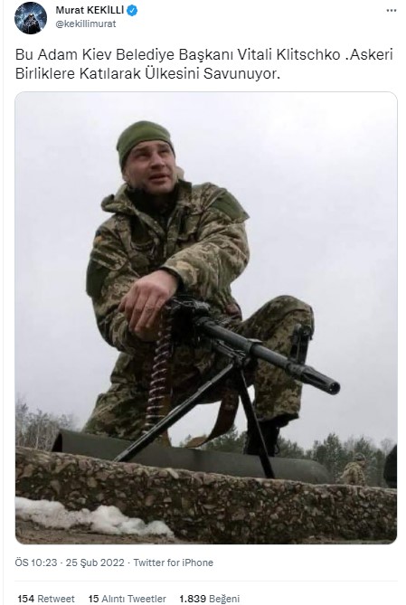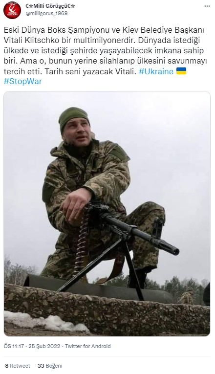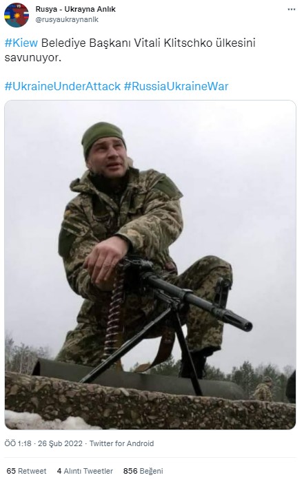 Kliçko’nun Twitter hesabı üzerinden, “şehrimizi savunacağız“, “dayanmalıyız, Ukrayna’ya zafer” yazan tweetler atması da bu iddianın yayılımında etkili olmuş. Sosyal medya Kullanıcıları, fotoğrafın güncel olarak yaşanan çatışmalar sırasında çekildiği düşünmüş. Üzerinde savaş üniformasıyla fotoğrafı çekilen Kliçko’nun, elinde bir makineli tüfek olduğu görülüyor.