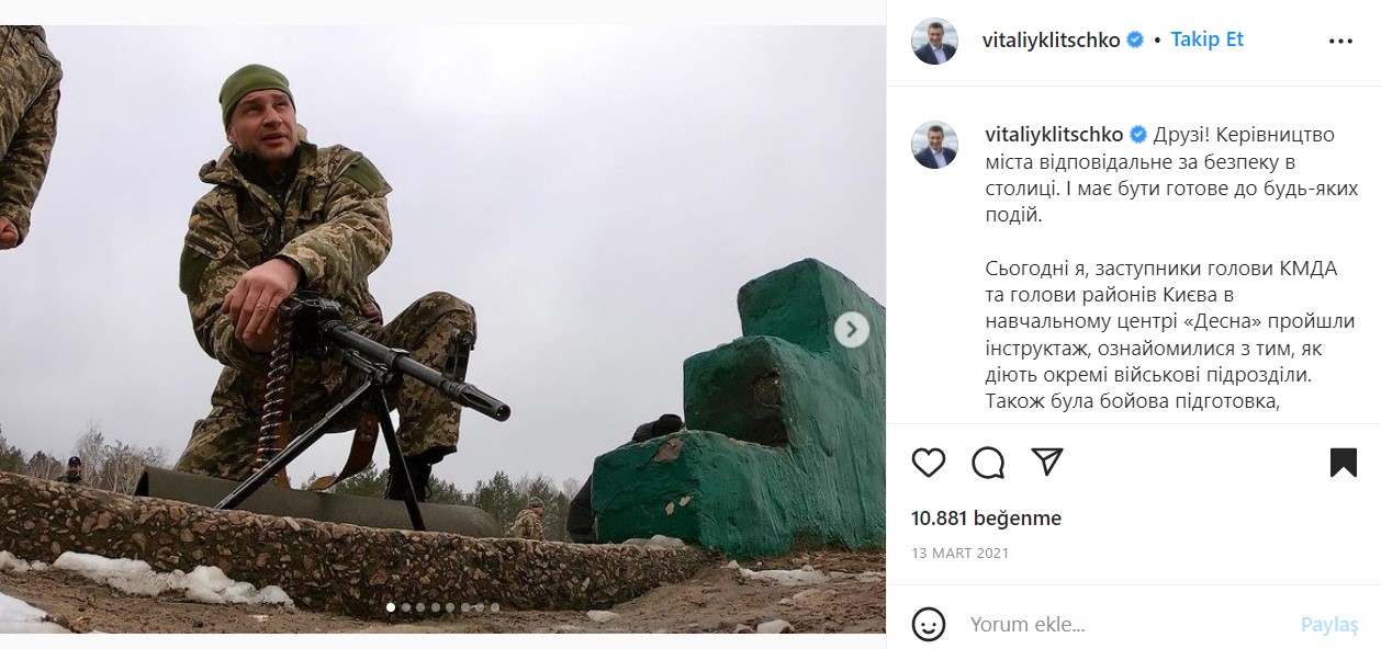 Kiev Belediye Başkanı Vitali Kliçko’nun kişisel sosyal medya hesaplarına baktığımızda ise, fotoğrafın 13 Mart 2021 tarihinde paylaşıldığına ulaştık. Başkan Kliçko’nun paylaşımında aktardığı yoruma göre, askeri bir eğitimde çekilmiş bu kare.