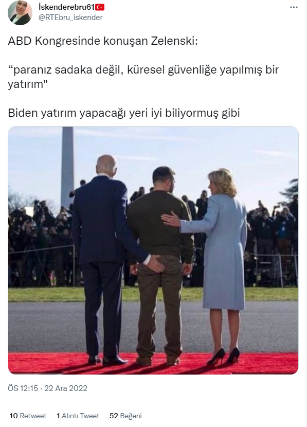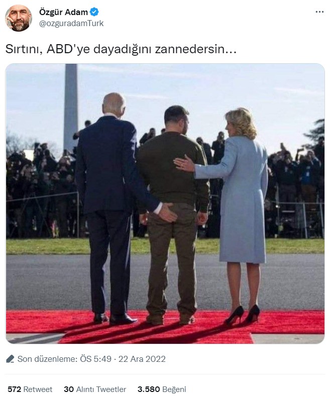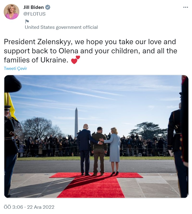 Vladimir Zelenski, Rusya-Ukrayna siyasi ve askeri krizi başlamasından bu yana ilk kez bir ülkeye; ABD’ye ziyarette bulunmuştu. Joe Biden, eşi Jill Biden ve Zelenski’nin çekildiği öne sürülen bir fotoğraf sosyal medyada kısa sürede viral hale geldi. Paylaşım sahibi tweetinde şu açıklamayı yaptı: