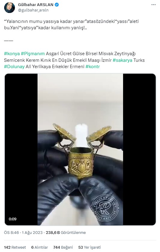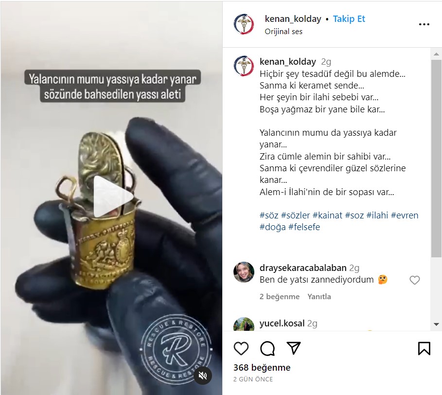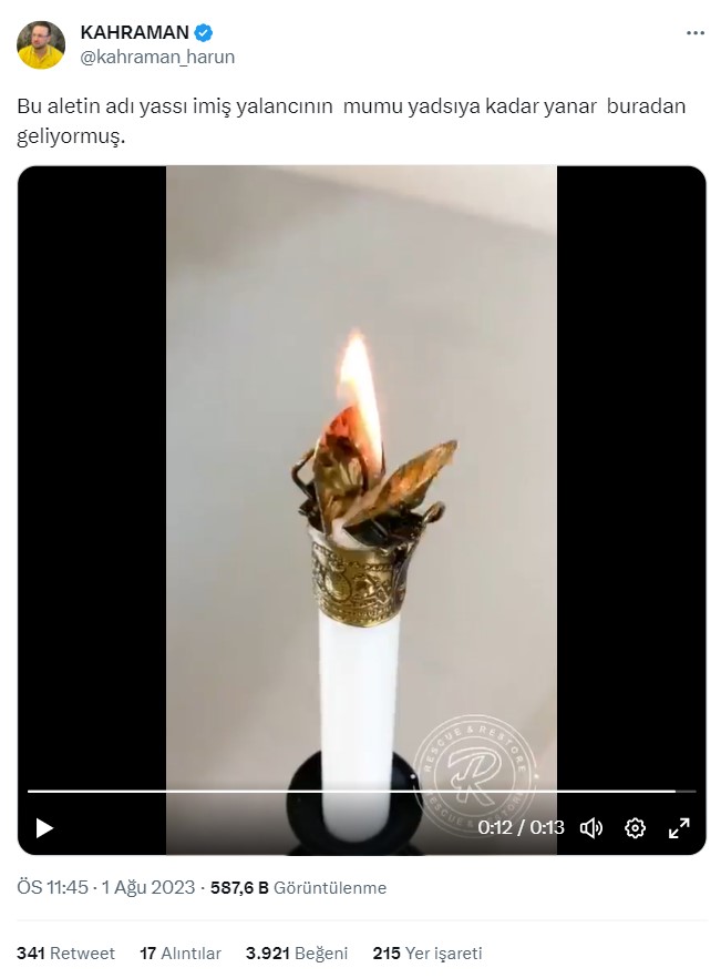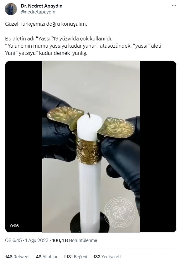 Araştırmaya videodaki aletin ne olduğunu tarayarak başladık. Arama sonuçlarına göre videoda görülen alet 19. yüzyılda kullanılan bir mum söndürücü. İddia videosundaki logoya bakıldığında görüntüyü doğrudan Rescue & Restore isimli hesaptan aldığı anlaşılıyor. Hesap, restorasyon videoları yayınlıyor. Bu video her ne kadar 2022 yılında paylaşılmış olsa da Twitter’dan 24 Temmuz 2023’te paylaşılmış. Bu paylaşımı takip eden son birkaç günde de aletin “yalancının mumu yatsıya kadar yanar” atasözünün kökenini gösterdiği iddia ediliyor.
