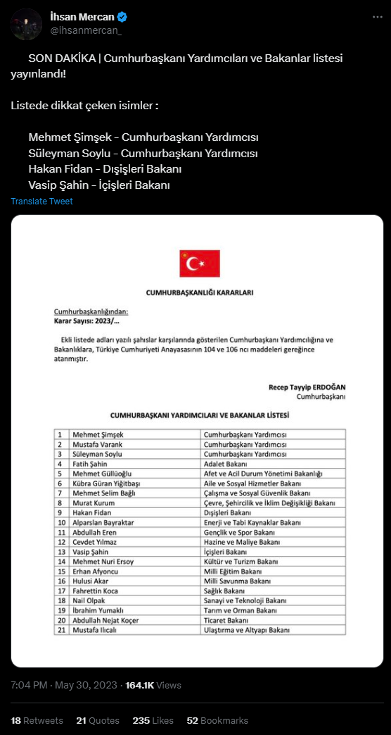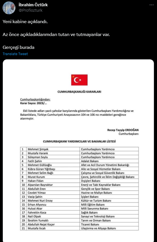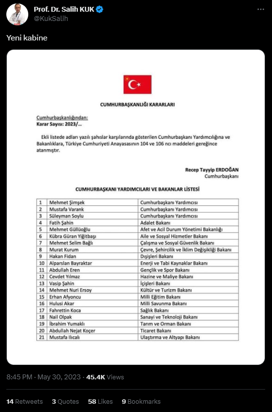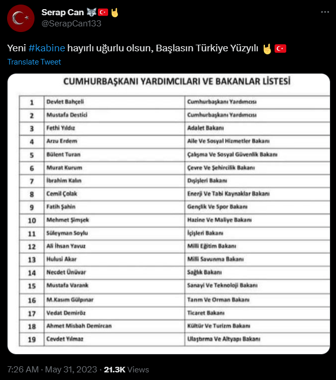 Bununla birlikte Cumhurbaşkanlığı seçimi 2. turunun geçici sonuçlarının ilan edilmesinin ardından sosyal medyada Cumhurbaşkanının yeni bakanları ve yardımcıları atadığına dair söylentiler başladı.