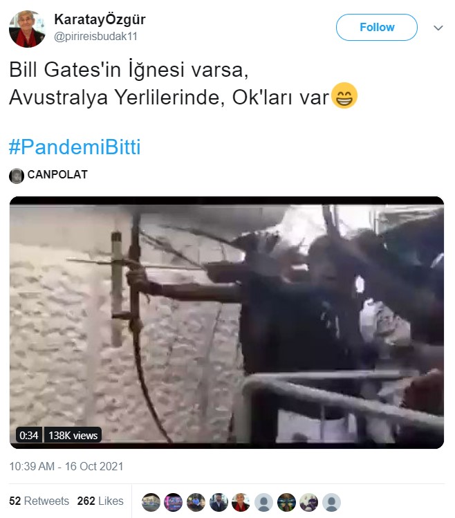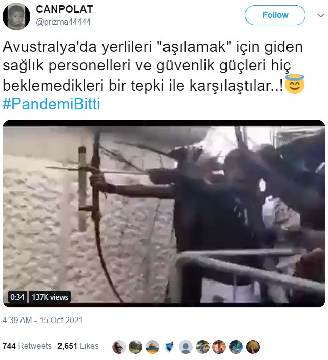 Geçtiğimiz günlerde Twitter’da bir video yayılmıştı. Kullanıcılar, paylaştıkları bu videoya açıklama olarak bunun aşı karşıtı bir protesto olduğunu ifade etmişti. Görüntüleri izlediğimizde, bir grup insanın ellerindeki ok ve yayı, üniformalarından polis olduğu anlaşılan ekibe doğrultmuş ve gerginlik oluşmasına sebep olmuştur. Paylaşımlar binlerce beğeni ve çok sayıda retweet etkileşimi almıştır. Bu videonun doğru olup olmadığını inceledik.