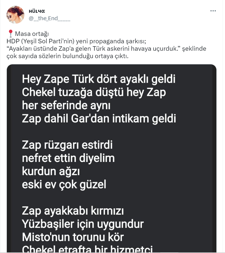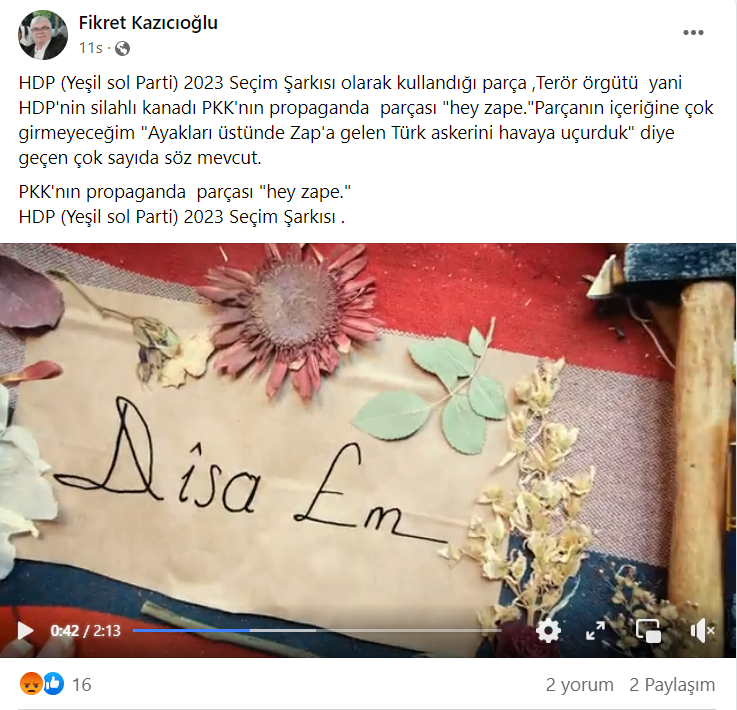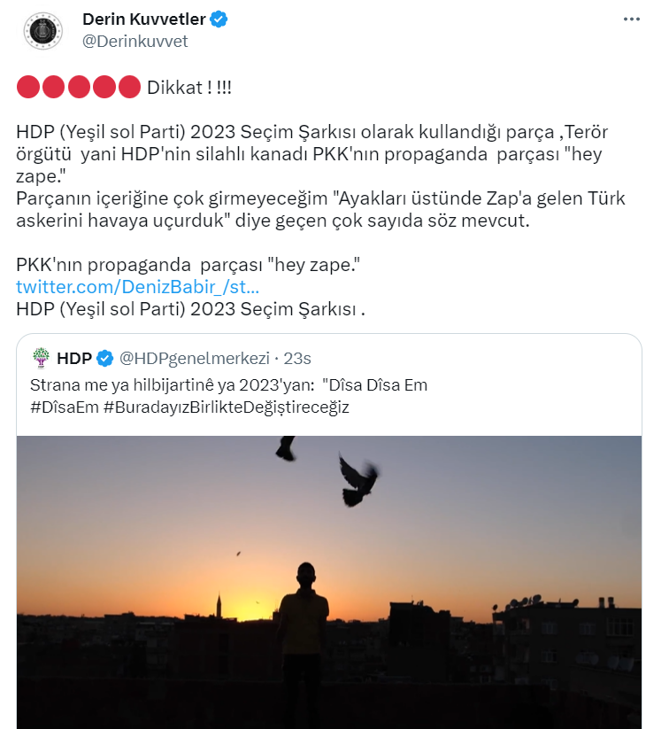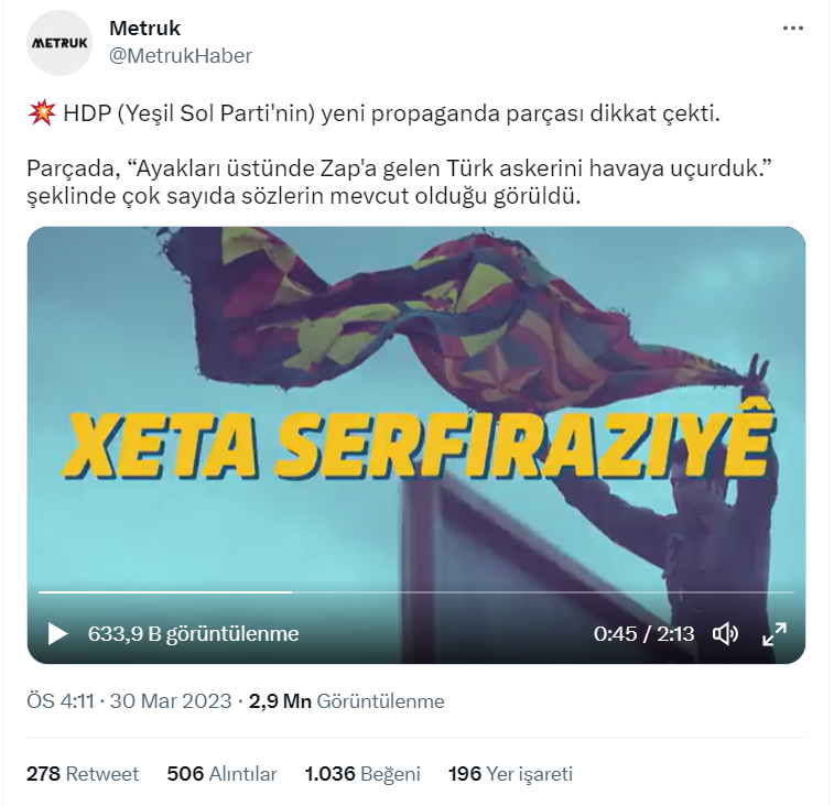 14 Mayıs seçimleri yaklaşırken siyasi partilerin görünürlüklerini artıracak seçim şarkıları, parti videoları paylaşılmaya başlandı. Geçtiğimiz günlerde de Halkların Demokratik Partisi’nin 2023 seçim şarkısı videolu bir şekilde yayınlandı. Seçim şarkısının videosunun ardından sosyal medyada şarkı içerisinde “Ayakları üstünde Zap’a gelen Türk askerini havaya uçurduk.” sözlerinin geçtiği iddia edildi.