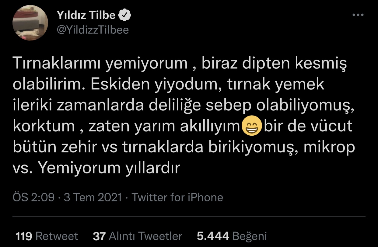 Yıldız Tilbe’nin hayranlarına cevap olarak paylaştığı tweet ilgi uyandırdı. Tilbe, “Tırnaklarımı yemiyorum , biraz dipten kesmiş olabilirim. Eskiden yiyordum, tırnak yemek ileriki zamanlarda deliliğe sebep olabiliyormuş” açıklamasında bulundu.