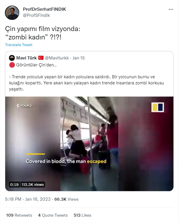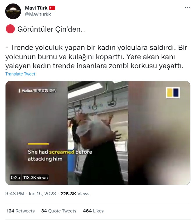 İlgili Yahoo haberine göre ‘zombi insan’ iddiasıyla paylaşılan ikinci video ise güncel değil. 18 Temmuz 2018 tarihli haberde, Chongqing Metro Hafif Raylı Sistemi’nde Li isimli bir kadın yolcunun aniden erkek bir yolcuya saldırdığı ifade ediliyor. Kadının adamı ısırdığı, adamın şiddetle direndikten sonra cep telefonuyla kadının kafasına vurarak kaçmayı başardığı bilgisi de haberde belirtilmiş. Haberde yer alan diğer görsellerde kadının zemindeki kan lekelerini yaladığı da görülüyor. Burada yerel polisin, saldırgan kadın için duygusal sorunları sebebiyle erkek yolcuyu ısırdığını ve kontrolünü kaybettiğini söylediği de belirtilmiş.