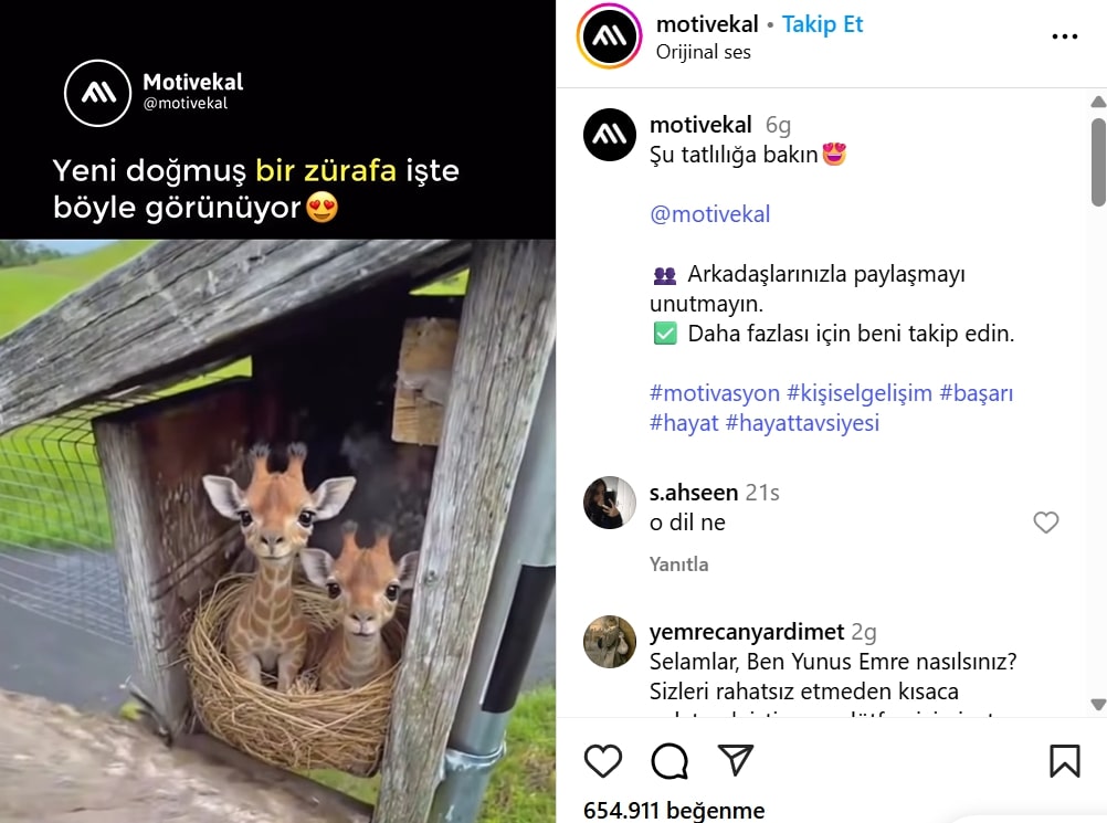 Sosyal medyada son derece ilginç bir video dolaşıma girdi. Görüntülerde, minik bir kuş yuvasının içinden başlarını uzatan zürafa yavruları yer alıyordu. İlk bakışta gerçekliği sorgulatan bu sıra dışı sahne, birçok kullanıcıyı şaşkına çevirdi. Kısa sürede milyonlarca görüntülenme alan video, çeşitli platformlarda gerçek bir doğa olayı gibi paylaşıldı.