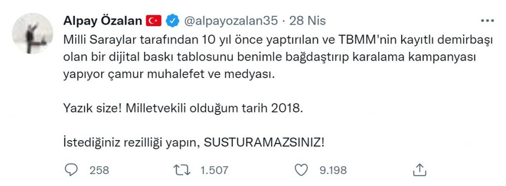 Olayın gelişim süreci ve bizim araştırmalarımız birleştiğinde TBMM’nin ‘çalıntı’ iddialarından yalnızca birinin yanlış olduğunu ortaya çıkardığını söyleyebiliriz. Yani eser asıl yerinden çalınan kayıp bir tablo değil. Milli Saraylar tarafından yaptırılmış ve halihazırda sergileniyor. Alpay Özalan’ın arkasındaki tablo, Resim Müzesi’ndeki yağlı boya tablonun dijital bir kopyasından başka bir şey değil.