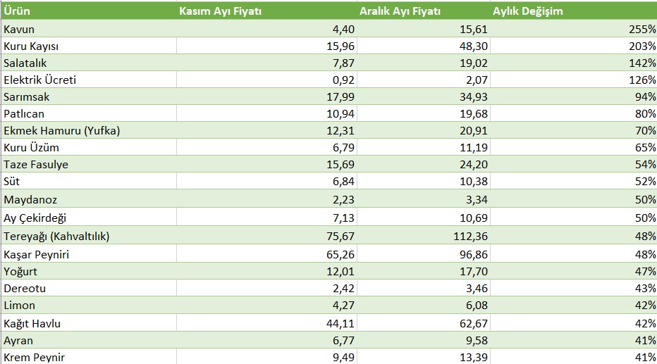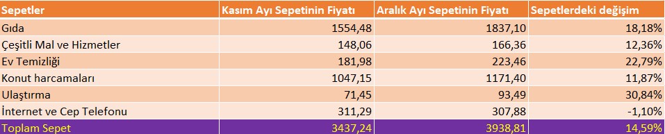 Doğrula sepetinin fiyatındaki bir aylık (Aralık Ayı) artış yüzde 14,59’dur. Gıda sepetinin fiyat artışı ise yüzde 18,18’dir.