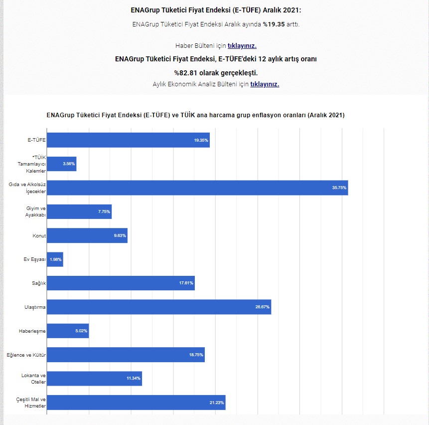 ENA Grup ise TÜFE’yi yıllık bazda yüzde 82,81 olarak hesaplarken aylık bazda yüzde 19,35 hesaplamıştır. Gıda enflasyonunu ise aylık bazda %35,75’dir.