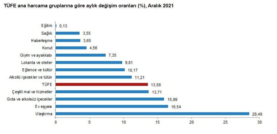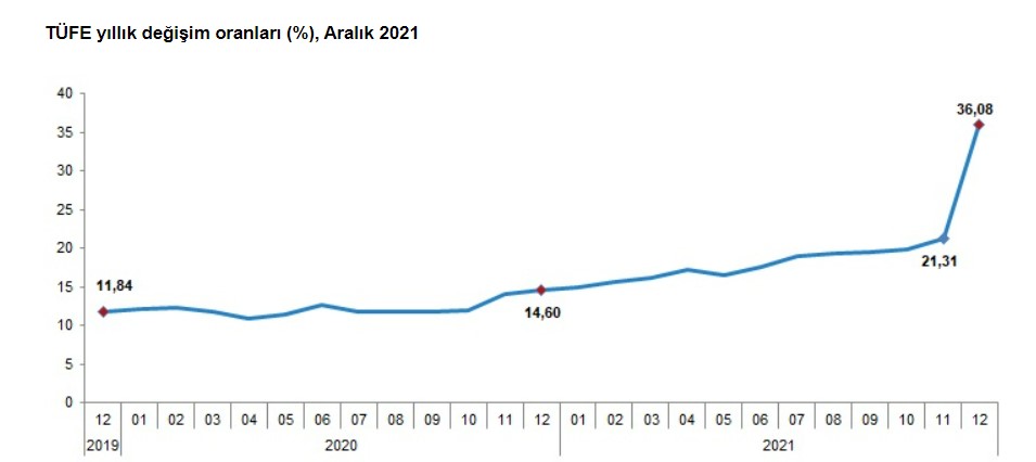 TÜİK’e göre Tüketici Fiyat Endeksi yıllık bazda yüzde 36,08 artarken aylık bazda yüzde 13,58 arttı. Gıda enflasyonu ise yüzde 15,99’dır.