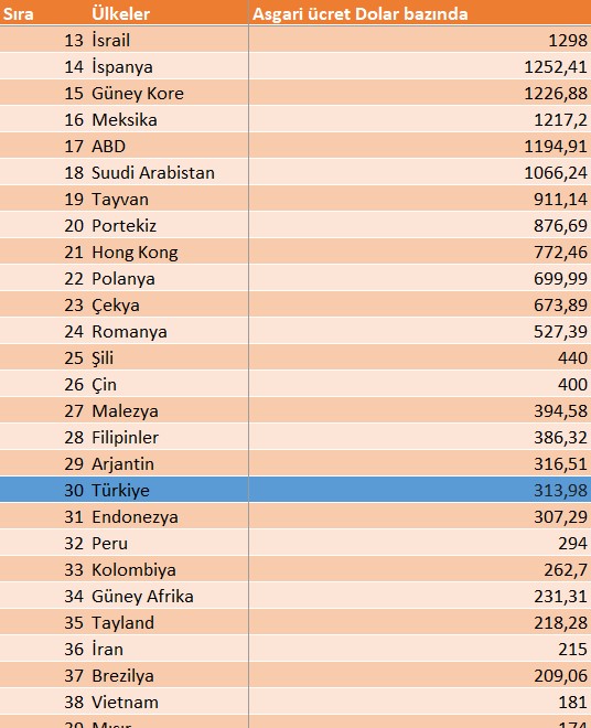 2021 yılında Türkiye’de asgari ücret brüt olarak 3 bin 477 TL’dir. 10 Aralık 2021 tarihinde bu ücret dolar bazında 258 dolara denk gelmektedir. OECD, Trading Economics, EUROSTAT, ILO gibi veri bankalarından aldığımız verilerden oluşturduğumuz tabloda ekonomisi en büyük 50 ülke arasında 258 dolar ile 33. sıradadır. Fakat, ilk 50 ülkenin 7’sinde asgari ücret kullanılmamaktadır. Türkiye 258 dolarlık asgari ücret ile Peru, Kolombiya, Filipinler, Malezya, Çin, Endonezya gibi ülkelerin arkasında yer almaktadır. 258 dolardan daha az asgari ücrete sahip olan ülkelerden bazıları ise Güney Afrika, Tayland, Brezilya, Rusya, Mısır ve Vietnam’dır. Fakat bu asgari ücretler konusunda belirtmemiz gereken bir durum var. Bu asgari ücretler brüt ücretlerdir. Bazı devletler bu asgari ücretlerden daha fazla vergi alırken bazıları daha az vergi alabiliyor. En büyük 50 ekonomiyi Dolar bazında asgari ücrete göre sıraladık. Aşağıda Türkiye’nin yerini gösterdik.