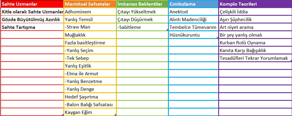 Doğrula olarak biz de FLICC’i Türkçe olarak size açıklamak istedik. Aşağıda, yukarıda verdiğimiz şeklin Türkçe halini tablo olarak görebilirsiniz. Tablonun altında başlıkları kısaca açıklayacağız. Neredeyse iki yıldırı gündemde olan Covid-19 hakkında yanlış haberleri yayan bilim karşıtlarından örnekler vereceğiz.