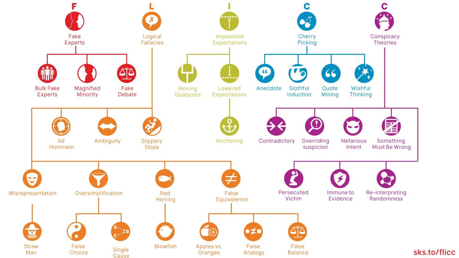 2009 yılında ise Pascal Diethelm ve Martin McKee Avrupa “European Journal of Public Health” dergisinde yayınladıkları makalede bu beş tekniği daha detaylı inceledi. Daha sonra iklim krizi ile ilgili ortaya atılan yanlış iddiaları inceleyen John Cook bu beş tekniğe FLICC ismini verdi ve üstüne pek çok çalışma yaptı. Yanlış bilgilerin ortaya çıkışı ve yayılımı ile ilgili dersler veren John Cook 2020’de yayınladığı yazıda kendi tasarladığı FLICC’in son halini kullanıcılar ile paylaştı. Cook’un paylaştığı FLICC’in son halinin grafiği aşağıdadır.