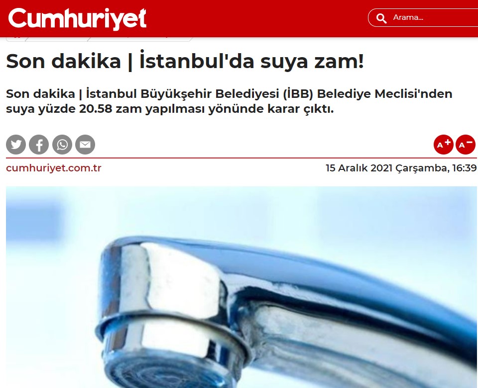 Haber mecralarında ve sosyal medyada yayılan bir iddiaya İstanbul’da suya yüzde 17,8 oranında zam yapıldı. Paylaşımlarda 15 Aralık 2021 tarihinde yapılan İstanbul Büyükşehir Belediye Meclisi toplantısı sonucunda su faturasına yüzde 17,8 oranında zam yapılacağı söyleniyor. Twitter’daki bazı kullanıcılar İstanbul’da suya zam geldiğini belirtti. 15 Aralık 2021’de Anadolu Ajansı, Habertürk, Sözcü ve Cumhuriyet’te İstanbul’da suya zam başlığı ile haber yaptılar. Öte yandan bazı haber siteleri ve Twitter paylaşımları ise aslında İstanbul’da suya yüzde 6 indirim yapıldığını belirtti.